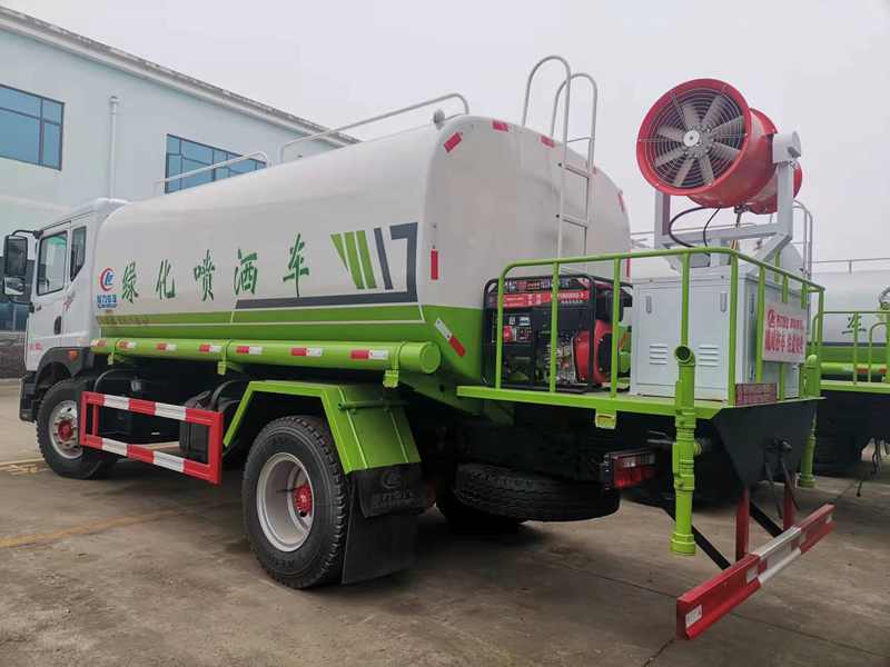 東風(fēng)多利卡D9綠化噴灑抑塵車,3950mm軸距,9.00R20鋼絲胎,罐體容積12立方米,該車具有免征公告(可免交車輛購置稅)。采用武鋼4mm優(yōu)質(zhì)碳鋼板一次卷壓成型,完全做到無縫成型。罐體內(nèi)設(shè)多道防波隔板,采用高壓氣體試漏檢測,使罐體具有強(qiáng)度高,重心穩(wěn),車輛4載安全平穩(wěn)。罐體外表涂底漆防銹漆以及裝飾面漆,罐體及各保險杠貼紅白色視覺反光條,罐體兩側(cè)噴“綠化灑水車”字樣(可按您的要求噴繪字樣),罐體顏色出廠為上白下綠或上白下藍(lán)(可按您的要求噴繪顏色)