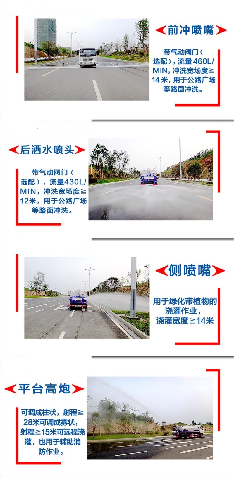 罐體有效容積5立方,罐體采用國標Q235碳鋼,罐體厚度4mm,自吸自排水泵,帶前沖裝置,后灑裝置,左右側噴裝置,尾部帶有安全操作平臺,帶消防接口,自流口,兩根輸水管,尾部綠化高炮,綠化高炮可調節直沖,大雨,中雨,毛毛雨霧,可以連續調節,360度旋轉;