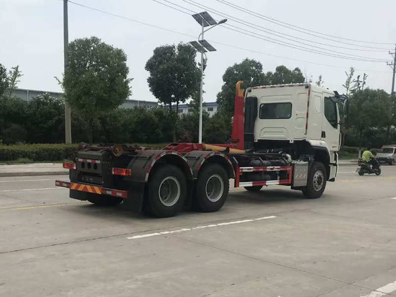 上裝配置:】勾起能力20T,設(shè)備自重2400Kg,鉤臂伸縮量1000mm,鉤箱時間45S,鉤心高度1570mm,鉤心到后滾輪距離5275mm,拉臂鉤結(jié)構(gòu)件Q460高強(qiáng)鋼Q345低合金高強(qiáng)鋼,該車是由汽車底盤、拉臂主油缸、附車架、翻轉(zhuǎn)架、支撐腿(選裝)、鎖緊架、鎖緊油缸及多路換向閥等組成。